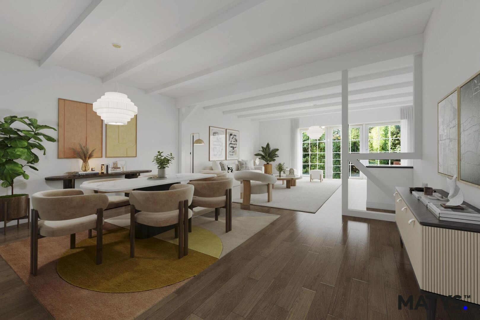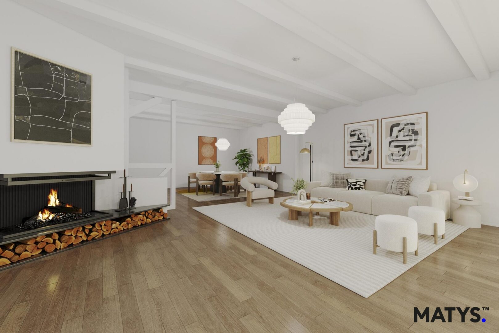Im Erdgeschoss empfängt Sie ein großzügiger, lichtdurchfluteter Wohn- und Essbereich mit einem offenem Kamin, der eine behagliche Atmosphäre schafft und besonders in den kälteren Monaten für gemütliche Stunden sorgt. Von hier aus gelangen Sie direkt auf die Terrasse mit angrenzendem Garten – ideal zum Entspannen oder für gesellige Abende im Freien.