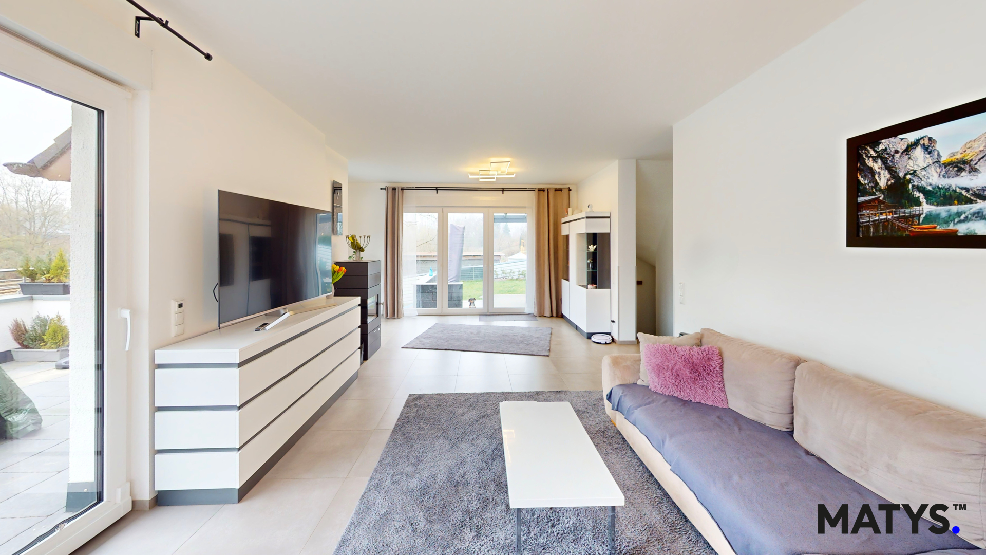 Das Herzstück des Hauses ist das weitläufige Wohnzimmer mit einem modernen Kamin, der an kühlen Tagen für eine behagliche Atmosphäre sorgt. Vom Wohnzimmer aus gelangt man auf zwei großzügige Terrassen – eine bietet einen schönen Sitzbereich, die andere führt direkt in den weitläufigen Garten.